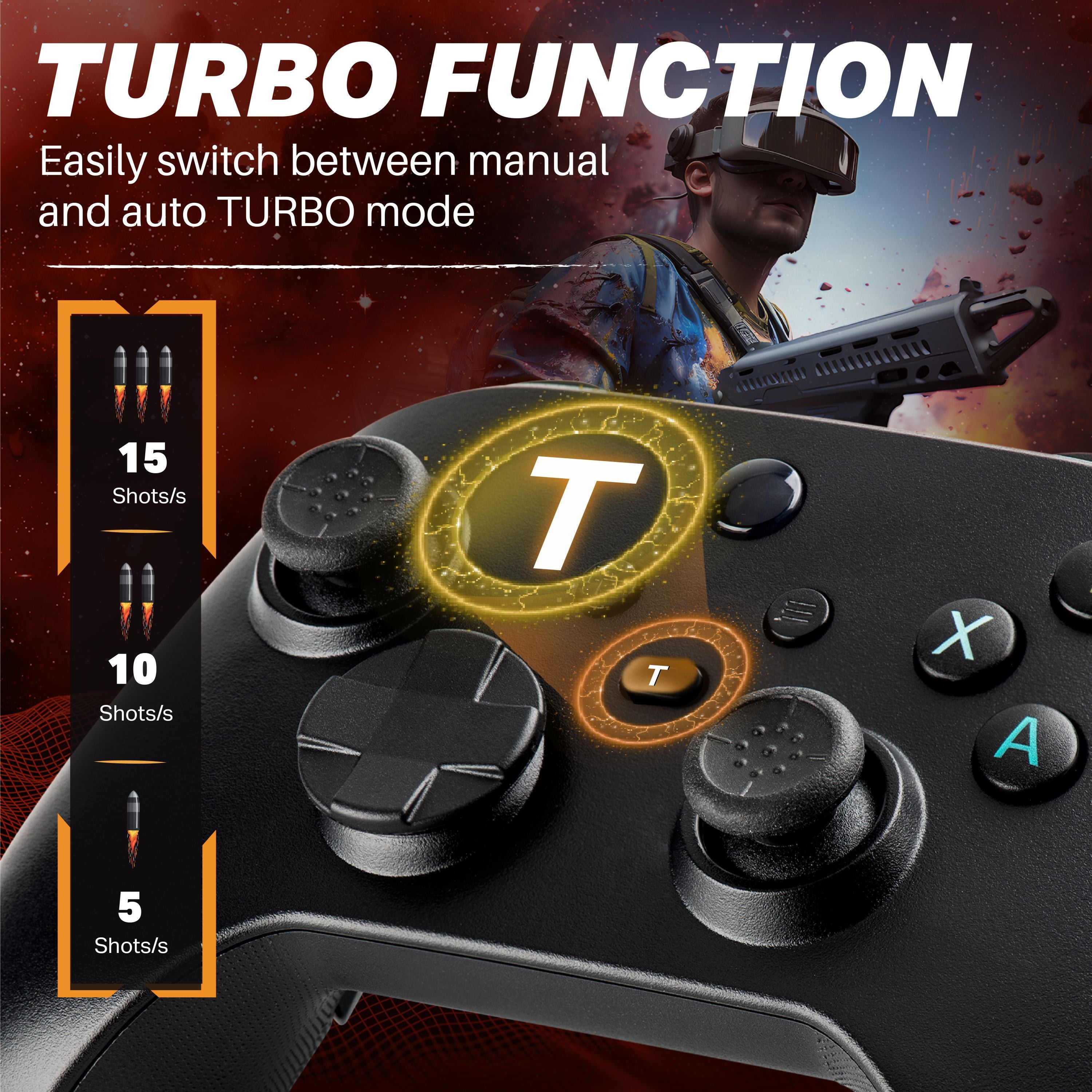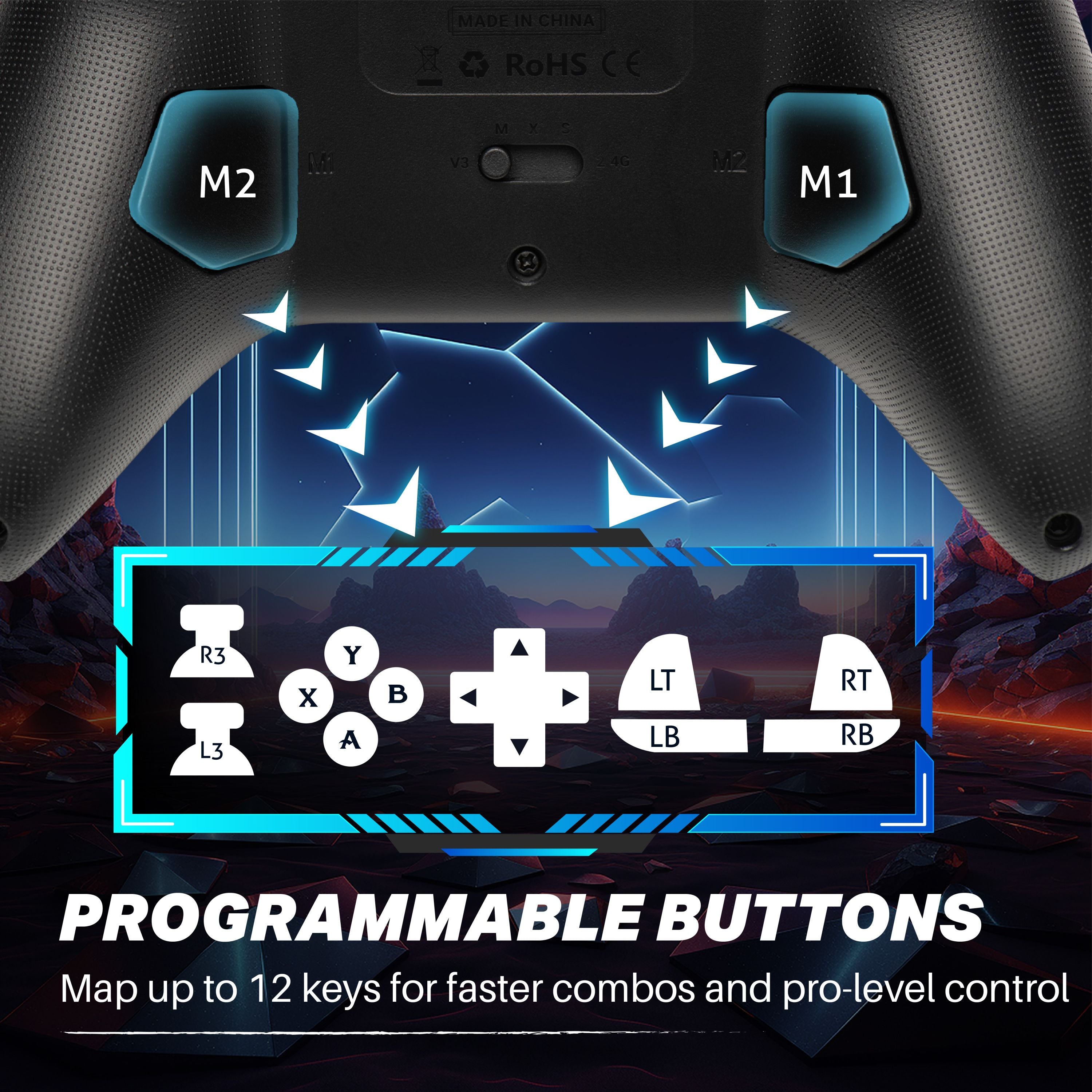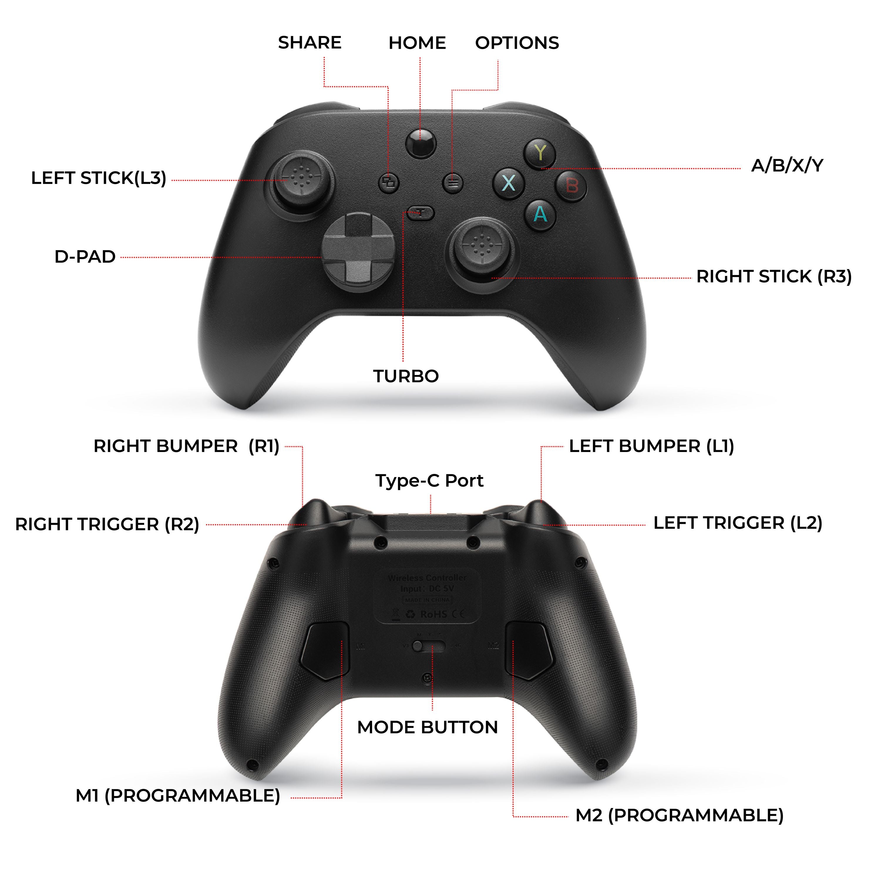 CUSTOMIZABLE BUTTONS & TURBO: M1/M2 rear buttons support up to 12 programmable functions for faster actions; the T button enables turbo and auto turbo modes for shooting and action games