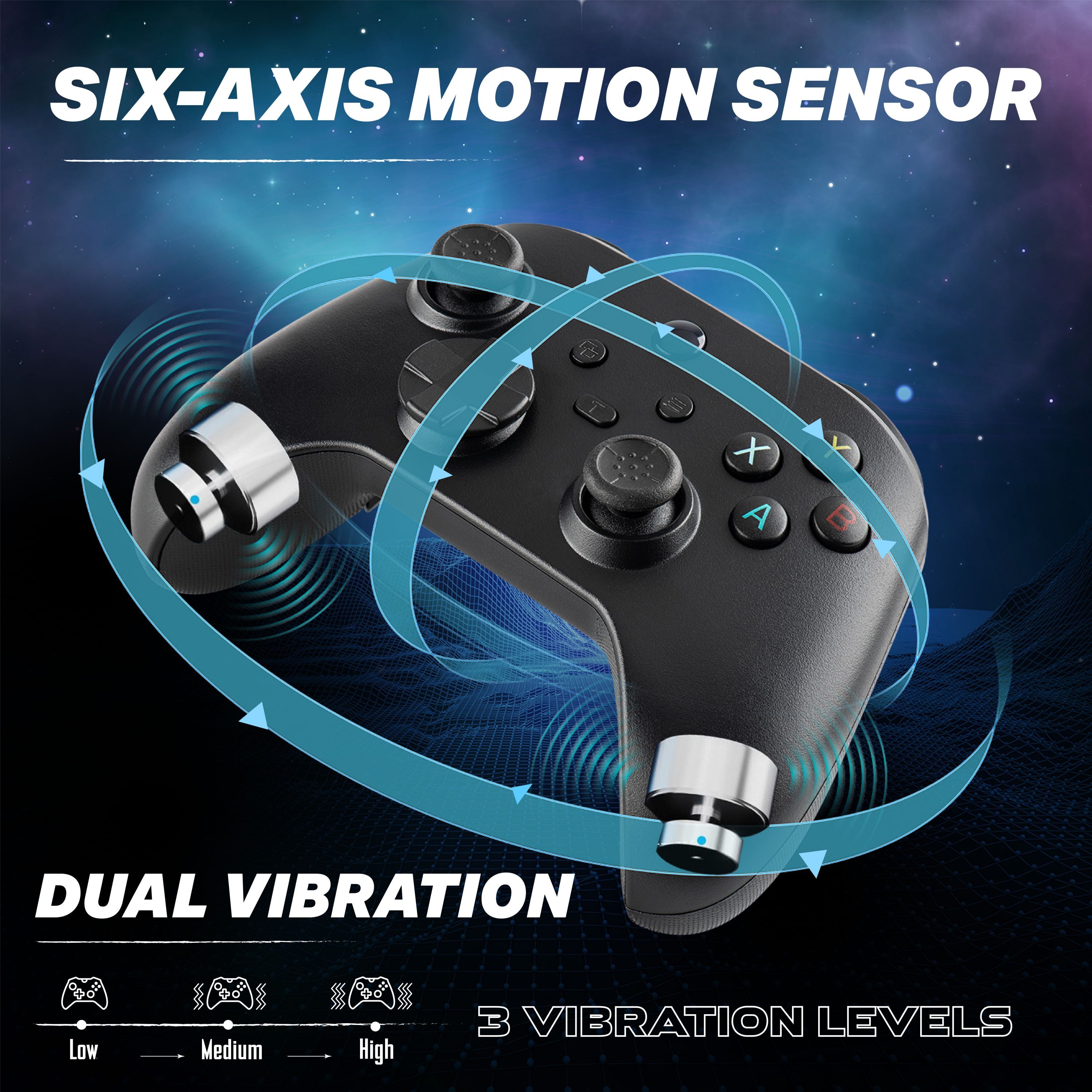 MOTION & VIBRATION FEEDBACK: 6-axis motion sensor with calibration and dual motor vibration with 3 selectable speeds provide immersive control